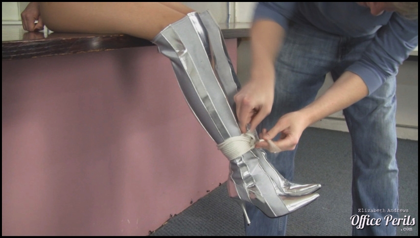 34 photos; 14:17 video Rachel walked into Mr. Big Boss' office wearing a tight silver mini skirt, blue blouse and peep toe pumps. She was a little nervous, since she had never been called into the Boss' office before. The Boss did not look too happy to see her. He got down to the reason why she was in his office fast; the latest reports Rachel had typed had typos in the header and they had to be redone. Rachel apologized and said she would get right on it but the Boss had other ideas in store of Rachel. The long legged brunette would be spending some time with him in his office. She could look at her punishment as a sort of a reward - since she would not be needed at her desk for the rest of the day. Mr. Big Boss tied a breast harness on Rachel to start with. He then tied her arms into a hammer lock behind her back. He intended on her staying in the same position for a very long time. Once her arms were secured the way he wanted them, the Boss picked up a pink shiny ball gag and gagged Rachel with it. He told her to sit on the ottoman in front of her and he tied her ankles together. He admired her really long legs as he finished tying her ankle knot. Mr. Big Boss picked Rachel up off the ottoman and carried her around to the other side of it. He placed her on her feet, making her unstable. He then XXXX her to lay on the ottoman. Since Rachel was so tall, she barely fit and had to balance herself to keep from sliding off. The boss tied her into a tight hogtie. Rachel moaned behind the pink ballgag as she struggled with her upper body. The Boss came around the ottoman and kneeled down in front of her face. He then placed a soft pink blindfold over her eyes and tied it tightly around her head. Without her sight, her movements seemed exaggerated. If she struggled to much with her legs, she might slide off the ottoman. She couldn't tell how far she was from the edge but she didn't want to be the secretary that fell off the stool during her punishment. She would be water cooler gossip for weeks. She continued to moan behind the gag as she struggled precariously. After a while, she felt the presence of someone in the room. Rachel figured it was one of the other executives messing with her or worse one of the secretaries. The Boss had warned her that there may be wandering hands while she endured her hogtie. But it was the Boss and he was adding more rope to her predicament. He tied a rope around the arch of her high heels, cinched it off and then tied the remaining rope off to her elbows. It helped keep her high heels on display in the air. Rachel continued to moan and struggle until her punishment was over, though she had no idea when that would be.... Item #511 ![]()