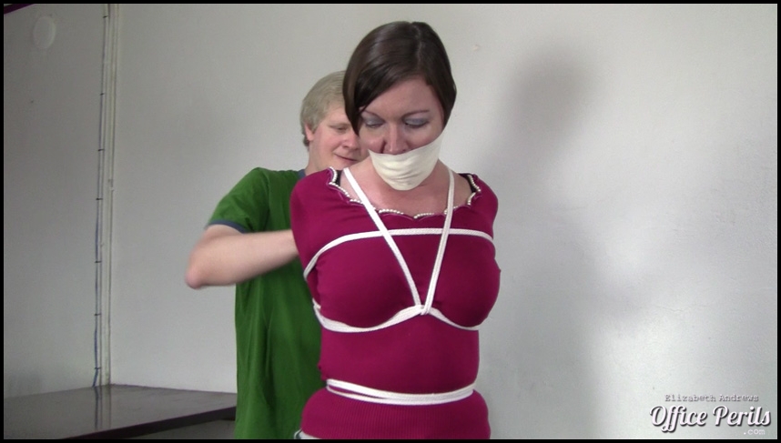 41 photos; 13:32 video Elizabeth and Star are still at the conference and Star is still tightly hogtied on the table when suddenly Mr Big Boss shows up to see where they were at the last meeting. One look at Star answers this question for him and he starts untying her, scolding Lizz for missing the meeting to have fun doing bondage instead saying "we do this sort of thing at night." With Star totally untied she takes out her gag and Mr Big Boss starts grabbing some rope to turn the tables on Lizz. Suddenly Lizz finds herself being bound with Star in front of her XXXX her a bit which Lizz reciprocates till she finds her elbows tightly bound behind her back. Star gag kisses her a bit and fondles her till she finally takes her gag off so she can participate more fully before Lizz's wrists fall prey to the rope also. Lizz finds herself being slightly stroked and tickled by Star while Mr Big Boss gags her with microfoam tape. Lizz is then placed up on the table they took Star down from and her ankles are bound while Star teases her a bit. David gets done binding Lizz and tells both of the ladies that he's actually got to get back downstairs to a meeting and that he's afraid he'll have to leave Lizz in Star's capable hands. Star definitely takes advantage of it and plays with Lizz a bit before putting her on the table and hogtying her. Not one to be done with just that she crawls up on the table herself and drapes herself on a tightly bound and gagged Lizz caressing her ass and cuddling up to her. Star has definitely found herself an enjoyable way to pass the time on this particular day of the conference. Item # 512 ![]()