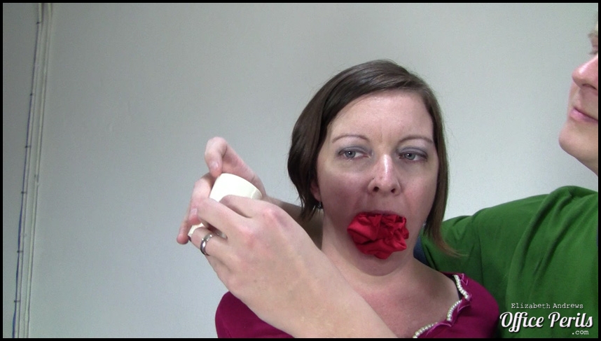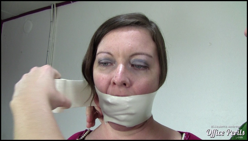 39 photos; 14:03 video Stacey is sitting on Mr Big Boss's desk with her legs crossed taking dictation when he decides that he's had enough and grabs some rope from his desk bringing it around front where he begins binding her. He starts with her elbows first moving then down to her wrists. He takes a black ballgag next and gags her with it strapping it tightly behind her head before grabbing microfoam tape and winding it around the ballgag securing it even more tightly in her mouth. A waist rope is added next cinching her arms off to her body and Stacey finds herself thoroughly bound and gagged and being fondled by Mr Big Boss. He puts her up on the desk and binds her ankles next before coming around behind and grabbing her pulling her back and pushing her onto her stomach on the desk. Mr Big Boss then takes another rope and hogties Stacey with it then takes his seat. He leaves her to struggle on the desk top and heads out to make his rounds of the office. Stacey rolls back and forth before Mr Big Boss finally returns groping her and rolling her around on the desk. He heads out a final time leaving her tied and fruitlessly struggling on the desk. Item #516 ![]()